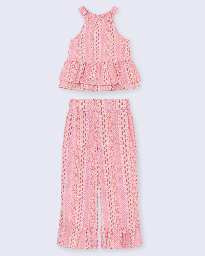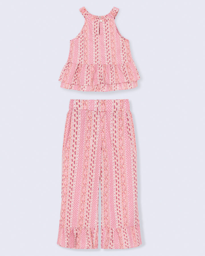 Conjunto leve e confortável, composto por blusa com babados e calça pantalona. Possui ajuste com botões na parte de trás da gola, garantindo praticidade na hora de vestir. A estampa étnica em tons de rosa e laranja deixa o look delicado e cheio de estilo.