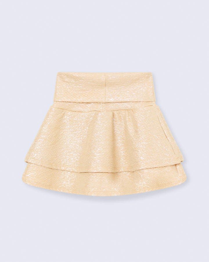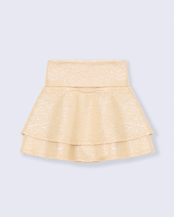A Saia Yara Dourado une brilho sofisticado ao conforto, graças ao seu tecido metalizado e texturizado. Com design em camadas que proporciona leveza e movimento, além de shorts internos para maior segurança, é a escolha ideal para composições elegantes ou festivas, garantindo estilo e funcionalidade em qualquer ocasião.