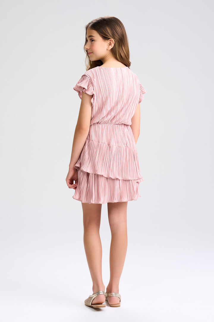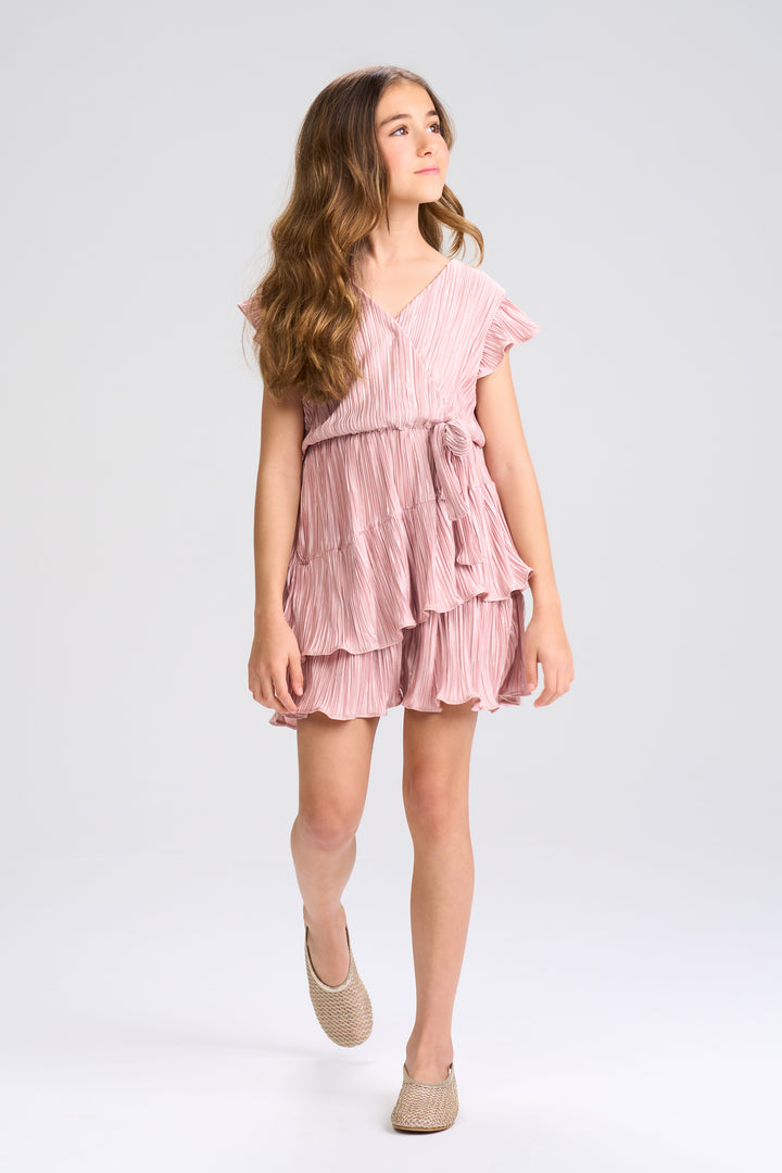 Vestido de manga curta com elástico e comprimento com babados, brilho e transpasse.