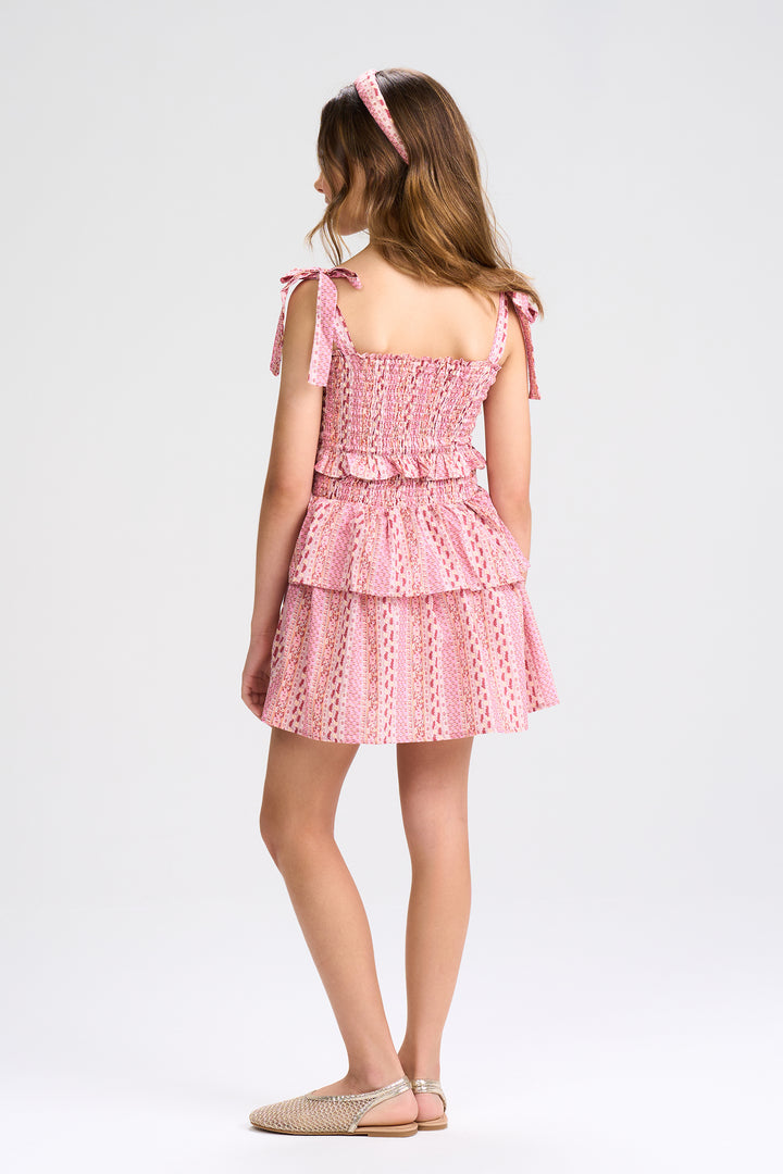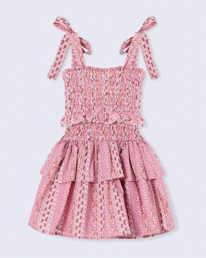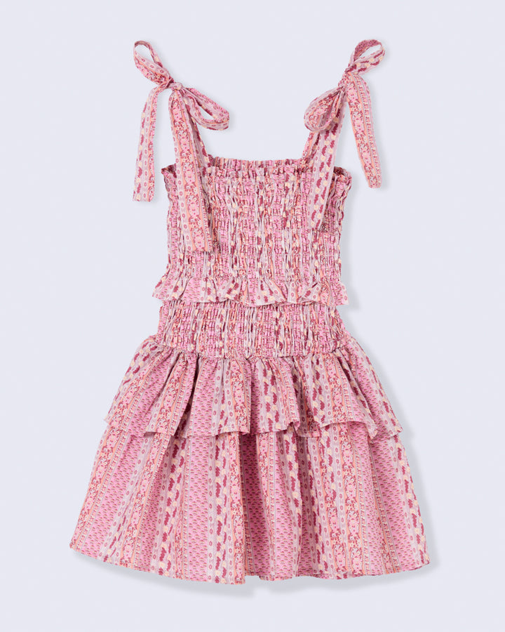 Vestido curto com lastex no busto, alcinhas ajustáveis e saia com babado. Confortável, leve e com estampa delicada em tons de rosa — ideal para um look romântico e casual.